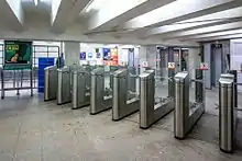 На станции имеется один вестибюль. Через подземный переход можно выйти на Азовскую улицу и Севастопольскую площадь. Переход в центре зала ведёт на станцию «Каховская», которая с 30 марта 2019 года по 7 декабря 2021 года была закрыта на реконструкцию. Открытие нового перехода в северном торце станции планируется в начале 2022 года.