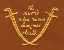 ![]() Тиснение на обложке первого печатного издания: два скимитара и надпись (в переводе — «меч означает чистоту + смерть») | |