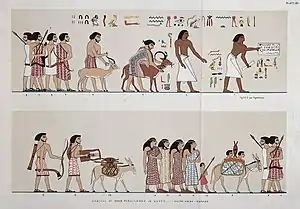 Одно из наиболее интересных свидетельств о той эпохе найдено в гробнице номарха Хнумхотепа, расположенной в Бени-Хасане. Там номарх изображён встречающим делегацию из 37 аму, или азиатов из Восточной пустыни, которые преподносят ему кохль — краску для глаз. Вельможе их представляет чиновник по имени Неферхотеп, держащий в руках табличку, на которой написано следующее: «Год шестой правления Сенусерта II; прибытие кохля, который 37 азиатов приносят ему». Предводитель делегатов назван «правителем (гик) пустынь, Абшаи». За ним следуют мужчины, вооружённые луками и копьями, а также женщины и дети, причём двое из последних едут верхом на осле. Делегаты одеты в богатые и тщательно продуманные наряды. Мужчины изображены с бородами, черты их лиц напоминают семитские, по крайней мере, у них большие «еврейские» носы. У женщин длинные тёмные волосы; на их ноги надеты туфли, а не сандалии. Очевидно, Абшаи был богатым вождём, и можно предположить, что подобные племена вряд ли в чём-то уступали египтянам. Из этого изображения следует, что азиатские племена (аму) получали разрешение селиться на землях Египта. За это они платили дань в царскую казну и чиновникам, которые были обязаны следить за порядком в таких поселениях.