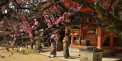 Дзиндзя (яп. 神社) — синтоистский храм (святилище, кумирня) — место, где пребывает ками, и где отправляют ритуалы в его честь[133][134][135]. Для храма обязательно наличие синтая или «тела божества» — физического объекта, в котором пребывает божество[133][136][137][138]. Обычно синтай — главный священный объект храма — хранится в главном здании (хондэне< 13 >) и скрыт от людских глаз, но иногда синтаем являются природные объекты, например, гора или водопад, возле которых возведено святилище[137][136].