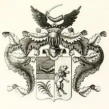 На щите дворянский коронованный шлем. Нашлемник: между двух распростёртых чёрных орлиных крыл находится в латах рука с мечом. Намёт на щите голубой, подложенный серебром (Гербовник, III, 57).