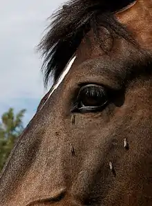 Большую часть головы занимают фасеточные глаза. На глазах у живых экземпляров заметен рисунок из полос и пятен различного цвета; у сухих мёртвых экземпляров они становятся одноцветно тёмными. Глаза покрыты короткими волосками или голые. У представителей подсемейства Chrysopinae на темени расположены три простых глазка, у других групп они полностью редуцированы (Tabanus, Haematopota), или на этом месте остаётся только глазковый бугорок (Hybomitra)[8]. У самок между глазами располагается широкая матовая лобная полоска (дихоптическое расположение глаз), на которой расположены блестящие нижняя и верхняя лобные мозоли. У самцов глаза соединяются (голоптическое расположение глаз)[9]. У живых особей многих видов, особенно у Chrysops и Haematopota, глаза блестяще окрашены, часто с характерным узором, который обычно исчезает после смерти[10].