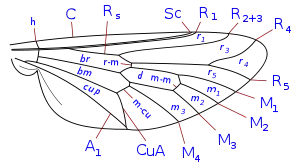 У слепней имеется одна пара хорошо развитых широких крыльев, прикреплённых к среднегруди. Перед местом крепления крыльев расположены обособленные склериты — нотоплевры. Обычно крылья прозрачные, но могут быть с затемнёнными перевязями и пятнами (Chrysops) или сетчатым мраморным рисунком серого цвета (Haematopota). На крыле выделяется сеть продольных и поперечных жилок, которые разделяют крыло на ячейки. Радиальная и медиальная жилки разделяются на четыре ветви каждая (см. схему). Четвёртая радиальная жилка вблизи впадения в пятую радиальную жилку иногда может нести отросток (придаток). Кубитальная жилка вливается в анальную. У основания крыла между костальной и субкостальной жилкой расположена плечевая жилка. Радио-медиальная, медиальная и медио-кубитальная поперечные жилки соединяют соответствующие продольные жилки. Эти жилки ограничивают расположенные снаружи от них радиальные и заднекрайние ячейки; ближе к основанию крыла от поперечных жилок расположены дискоидальная, передняя и задняя базальные ячейки. Позади крыльев расположены жужжальца, состоящие из стебелька и булавовидной головки. Головка может быть белой, жёлтой или чёрно-коричневой. Жужжальца отходят из заднеспинки и по происхождению являются рудиментами второй пары крыльев[15][16][17].
