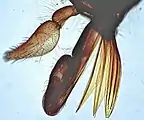 Конечные сегменты брюшка называются терминалиями, они образуют копулятивный (совокупительный) аппарат. VIII стернит самки называется субгенитальной пластинкой и прикрывает половое отверстие. IX и X тергиты обычно разделены продольно; У Pangoninae IX тергит цельный. IX стернит преобразован в генитальную вилку (фурку). В апикальной части фурки расположены парные клеевые железы, от базальной части отходят три семяпровода, которые, изгибаясь, заканчиваются сперматеками. X и XI сегменты сильно редуцированы. X тергит заканчивается парными церками, прикрывающими анальное отверстие. У самца VIII тергит более узкий. Слившиеся IX и X тергиты у самца называются эпандрием. IX стернит (гоноподит) сильно хитинизирован и несёт пару пальцевидных выростов — гонококситов. На концах гонококситов располагаются гоностили, функцией которых является удержание брюшка самки во время спаривания. В средней части гоноподита расположен фаллус, покрытый хитиновым чехлом — эдеагусом[21]. В брюшке самки имеется особый орган, называемый клеевыми железами. Выводной проток этих желёз открывается в яйцевод. Выделяемое ими клейкое вещество служит для прикрепления яиц к субстрату[22].