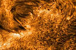 Фотография хромосферы над активной областью Солнца № 10380 в линии водорода Hα. Характерная фактура хромосферы, напоминающая «горящие прерии», создаётся спикулами.