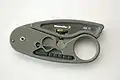 - Стриппер для коаксиального кабеля внешне схож с предыдущей моделью. Отличается наличием двух лезвий и сменной вставкой зажима для работы с проводом различного сечения. Два лезвия необходимы для практически одновременного надрезания как внешней, так и внутренней изоляции коаксиального кабеля. Такой инструмент требует точной настройки с учётом сечения кабеля, толщины внешней изоляции и толщины центральной жилы. Этим типом стриппера подготавливают кабель для работы с обжимными коннекторами.