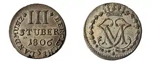 В начале XIX века после захвата прирейнского региона войсками Наполеона на его территории было образовано великое герцогство Берг — вассальное государство Франции, правителем которого был назначен муж сестры Наполеона Иоахим Мюрат. При нём в 1806—1807 годах продолжалась чеканка штюберов старого образца — с использованием в монограмме его инициала (J) в окружении лавровых ветвей вместо окружённых гирляндой инициалов MJ короля Баварии Максимилиана Иосифа[52]. После Наполеоновских войн Рейнская область перешла под власть Пруссии, после чего прусское правительство полностью прекратило выпуск штюберов.