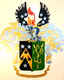 Щит разделён перпендикулярно на две части, в правой в чёрном поле между тремя серебряными звёздами находится золотое стропило, с означенными на нём тремя горящими гранатами. В левой части в зелёном поле три золотые хлебные колоса, стеблями в сердце щита соединенные, из которых два к обоим верхним углам накось, а третий прямо к подошве щита простираются.