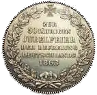 GOTT MIT UNS (рус. С нами Бог) | Герб Бремена. Круговая надпись «FREIE HANSESTADT BREMEN / EIN THALER GOLD» | Надпись «ZUR 50JÄHRIGER JUBELFEIER DER BEFREIUNG DEUTSCHLANDS 1863» (рус. К 50-летию освобождения Германии) в венке из дубовых ветвей и крест Ганзейского союза | 1863 | 20005[4] | 17,539 г серебра 986,11 пробы |