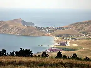 ![]() Вид с Тепе-Оба на пос. Орджоникидзе и Двуякорную бухту. |
