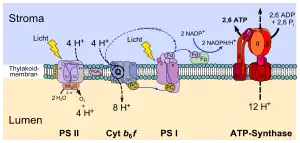 - Передача электрона от фотосистемы II к пластохинону во время светозависимой реакции фотосинтеза, входящей в нециклическую электронтранспортную цепь, потребляет два протона из стромы. Они переносятся в просвет тилакоида, когда восстановленный пластохинон окисляется цитохромным комплексом b6f на стороне тилакоидной мембраны, обращенной к просвету. От пластохинона электроны передаются цитохромному комплексу b6f, который напоминает цитохром bc1.