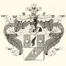 На щите дворянский коронованный шлем. Нашлемник: три страусовых пера. Намёт на щите голубой и красный, подложенный золотом.