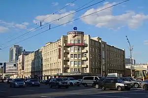 В 1928 году по проекту архитектора В. К. Олтаржевского на месте снесённых строений, со значительным отступом от прежней красной линии улицы, был построен дом для кооператива «Московское объединение». Здание имело 5 этажей, угловая часть была оформлена балконом, располагавшейся над трёхэтажным полукруглым эркером, и завершалась высоким пилоном с круглым окном и пирамидальным аттиком. Однако уже в начале 1930-х годов дом был перестроен архитектором В. М. Маятом: он надстроил 6-й этаж, сделал башню гранёной и поднял её на всю высоту прежнего аттика. По торцам пилонов и над входным вестибюлем были высечены крупные рубленые надписи «Универмаг Торгсин»[11].