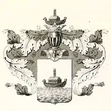 На щите дворянский коронованный шлем. Нашлемник: означенное на щите судно. Намёт на щите серебряный, подложенный зелёным.