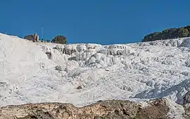 Памуккале в Турции — травертиновые отложения на склоне горы — объект Всемирного наследия ЮНЕСКО.