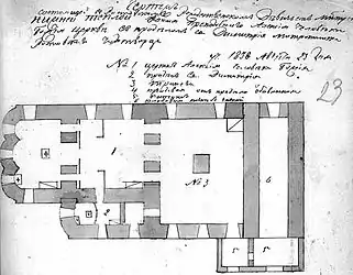 - План первого этажа собора Рождественского монастыря (Ростов Великий). Чертёж 1838 г. РФ ГАЯО. Ф. 190. Оп. 1. Д. 337. Л. 23.