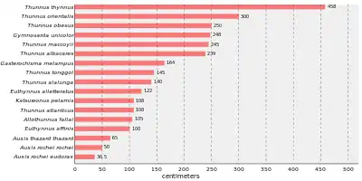 Источник Охранный Подрод Thunnus Длиннопёрый тунец Thunnus alalunga 1,4 1,0 60,3 9—13 4,31 [10][11]