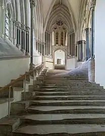 В поперечном сечении собор имеет обычное для крупной церкви строение: центральный и два боковых нефа соединены аркадой, которая образует первый ярус вертикального членения главного нефа. Над аркадой вторым ярусом располагается трифорий, третий ярус — окна под сводами[84]. Высота нефа составляет лишь 67 футов (20 м), что очень мало по сравнению с французскими готическими соборами[85]. Сильным акцентом на горизонталь является уникальный трифорий из совершенно одинаковых пролётов, не создающих обычного деления на секции. Также трифорий отделяется от нижней аркады непрерывной тягой, и вообще на стенах нет ни одной непрерывной вертикальной линии, потому что колонки, поддерживающие свод, начинаются выше трифория[84].