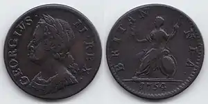 В 1672 году новый король Англии Карл II (1660—1685) начал чеканить медные фартинги на королевском монетном дворе. Новые монеты несли на реверсе изображение Британии (лицо Британии было повёрнуто влево, в отличие от привычного изображения Британии на монетах XIX—XX веков). Фартинги 1672—1675 годов и 1679 года весили 5,2—6,4 г и имели в диаметре 22—23 мм.