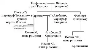 3. Феодора III — дочь предыдущей. Часто путают с матерью. Вышла замуж за Джованни Кресченци, представителя знаменитой семьи. Была матерью (или сестрой) папы Иоанна XIII.