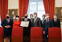 После победы на парламентских выборах в октябре 2021 года пяти оппозиционных партий их представители выразили намерение создать коалиционное правительство, и в качестве кандидата на пост премьер-министра был выдвинут Петр Фиала[19]. 28 ноября президент Милош Земан назначил Петра Фиалу новым премьером и поручил ему формирование правительства[20][21].