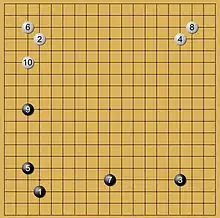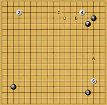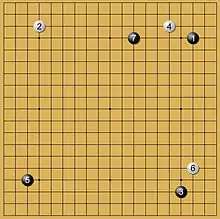 При построении с двумя комоку (диаграмма 1) пятым ходом чёрные огораживают один из углов. Естественным продолжением для белых будет воспрепятствование такому же ограждению второго угла, поскольку тогда у чёрных прибавится слишком много территории[63].