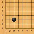 - Такамоку (5-4) также направлен на одну из сторон. Этот ход обладает сильным влиянием на центр. Как и в случае с хоси, он не гарантирует получение территории в углу. Ход 5-4 применяется игроками, склонными к развитию влияния и продолжению борьбы в центре[19].