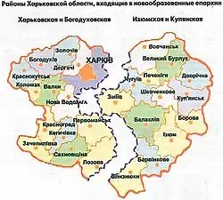 8 мая 2012 года решением Синода УПЦ из состава Харьковской епархии была выделена Изюмская и Купянская епархия в составе 13 районов Харьковской области. В составе Харьковской епархии остались Харьков и 14 районов.[6].