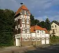 Вход на территорию старого здания железнодорожной станции города. Памятник архитектуры c 1984 года. Коттедж стиля фахверк с использованием природного камня.