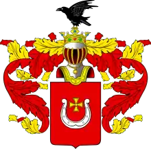 В щите, имеющем красное поле, изображён золотой крест и под ним серебряная подкова, шипами обращённая вверх.