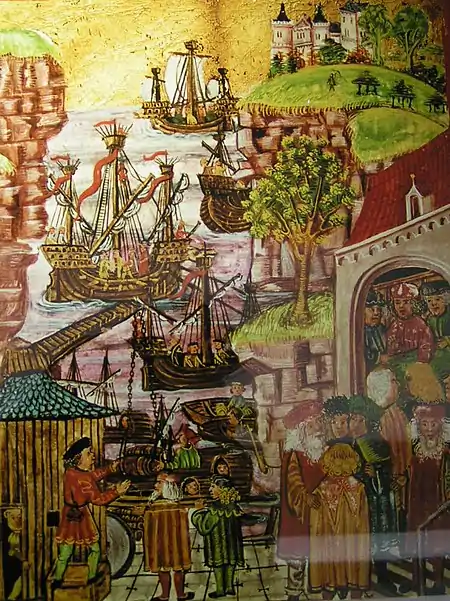 Изображения лодок и судов подобной конструкции широко распространены и в Средиземноморье, в первую очередь в Италии — лодка[9] и трёхмачтовое судно[10] на мозаике в Соборе Святого Марка в Венеции (конец XIII века), два нефа на барельефе в Пизанской башне[11], изображения нефов в тетради Канала (итал. Zibaldone da Canale) (XIV век) и другие.