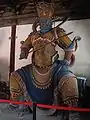 В зале установлены три большие статуи минского времени. В центре Шакьямуни, слева Будда Медицины и справа Амитабха. За этими статуями, лицом к заднему выходу установлен Самантабхадра. По бокам статуи 20 девов.[6] Фрески за статуями богов выполнены во времена Цин. На потолке вырезаны большие драконы.[7]