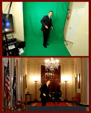 Главный объект снимается на фоне одного цвета или на фоне с относительно небольшим перепадом по цветам. Обычно используются фоны синего или зелёного цветов, так как у людей кожа таких цветов не встречается[14]. Процесс замены исходного фона на другой называет композитингом или кеингом.