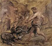 Подойдя к самому входу в Аид, он обнаружил прикованных Тесея и Пирифоя, которые умоляли их освободить. Гераклу удалось освободить только Тесея. Когда он увидел бога Аида, то стал просить отдать ему Цербера. Тот разрешил взять собаку при условии, если Гераклу удастся одолеть «аидова привратника» голыми руками. Геракл, будучи защищён панцирем и шкурой немейского льва, обхватил шею пса и душил чудовище, пока не укротил[25].