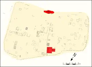 За пределами укреплений в 1987 году здания были раскопаны несколько зданий из сырцового кирпича.