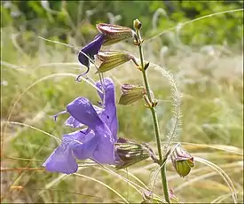 Соцветие простое или ветвистое, с одной-двумя парами длинных ветвей, с 5—10 расставленными 4—6-цветковыми ложными мутовками; чашечка длиной 12 мм; венчик ярко-синий, длиной 3,5—4,5 см.