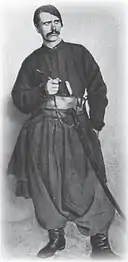 Шаровары (укр. шарова́ри)[5] в украинский язык это слово попало из тюркских языков. Шаровары — один из элементов мужского костюма запорожских казаков. Больше всего на шаровары запорожских казаков походят брюки из курдского костюма, которые носятся навыпуск и подобно казакам подпоясываются широким и длинным поясом. Кроме того, шаровары, обычно красного или синего цвета, — часть украинского национального костюма, наряду с вышиванкой и поясом-кушаком. Были широко распространены среди запорожского казачества, но несколько в другом виде, без очень низкой талии и мотни, в виде просто свободных штанов. Ранее были повседневной одеждой, сейчас служат праздничной.