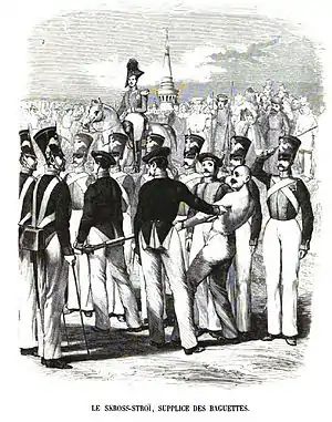 Осуждённого заставляли проходить сквозь строй из 100—800 солдат, которые прутьями били по спине осуждённого. В начале XIX века число ударов доходило до 6 тысяч[2]. В этом случае «прогнание сквозь строй» было равносильно смертной казни. В России шпицрутены отменены 17 апреля 1863 года.