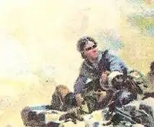 Правее, у станкового пулемёта,— отважный воин Кузьма Москаленко. В тот день Москаленко подавил огонь четырёх вражеских пулемётов и одним из первых вышел на гребень Сапун-горы. Перед ним в воронке от разорвавшегося снаряда занял позицию снайпер старшина Николай Морятов. Свыше двух десятков гитлеровцев сразил он во время штурма.