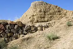 | Фундамент внешней стены с выступающими контрфорсами. | Сохранившаяся отмостка на южной стене. | Структура стены: каменное основание, выше стена из кирпича-сырца. (За прошедшие столетия стена из кирпичей превратилась в глиняную массу, где лишь просматриваются очертания древней кладки.) |