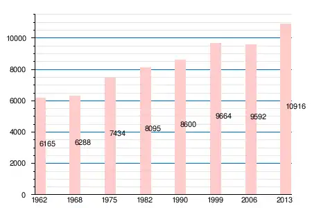 | 6165 | 6288 | 7434 | 8095 | 8600 | 9664 | 9592 | 10301 | 10559 | 10764 | 10916 |