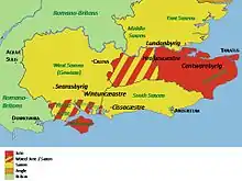 В 680-х годах Королевство Уэссекс было на подъеме, союз между южными саксами и мерсийцами и их контроль над южной Англией оказывал давление на западных саксов.[21] Их король Кэдвалла, вероятно, обеспокоенный влиянием Мерсии и Суссекса в Южной Англии, завоевал земли южных саксов и захватил ютские районы в Хэмпшире и на острове Уайт. Беда описывает, как Кэдвалла жестоко подавлял южных саксов и пытался вырезать ютов на острове Уайт и заменить их людьми из «своей собственной провинции», но утверждал, что тот не смог этого сделать, и юты оставались большинством на острове.[lower-alpha 3][23]