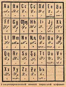 В 1926 году Тюркологический конгресс в Баку рекомендовал перевести все тюркские языки на латинский алфавит. С апреля 1926 года общество Jaꞑa tatar əlifвasь/Яңа татар әлифбасы («Новый татарский алфавит») начало работать в Казани[2].