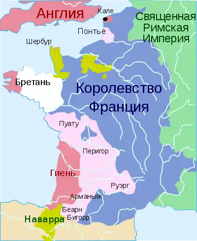 Франция после подписания мирного договора в Бертиньи. Красный цвет: территории, контролируемые Эдуардом III. Розовый цвет: территории, переданные Англии Францией по договору в Бретиньи в 1360 году