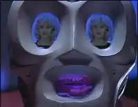 - англ. ridiculous-looking robot head (which contrasts sharply with the generally sophisticated special effects of the series and is reminiscent of the intellegent toaster of the early Red Dwarf)