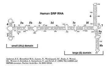 Длина 7SL РНК около 300 нуклеотидов, выделенная из SRP молекула РНК имеет коэффициент седиментации 7S[6]. Во вторичной структуре 7SL РНК есть восемь спиральных элементов, которые складываются в Alu-домен и S-домен, разделенные длинной линкерной областью[7]. Считается, что Alu-домен опосредует функцию замедления элонгации пептидной цепи[7]. Спираль 8, которая взаимодействует с M-доменом белка SRP54, опосредует распознавание сигнальной последовательности. Последовательность спирали 8 обладает высоким сходством с гомологичными РНК бактерий и архей. Считается, что комплекс «SRP19 — спираль 6» участвует в сборке SRP и стабилизирует спираль 8 для связывания с SRP54[8].