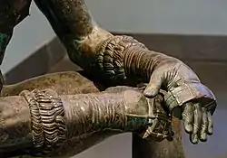 Кулачные бои были включены в программу Олимпийских игр в 688 году до н. э. До V в. до н. э. бойцы обматывали кулаки мягкими кожаными ремнями (caestus), оставляя пальцы свободными. Именно такие ремни можно видеть на руках «кулачного бойца». Позднее использовали перчатки с металлическими бляхами[4].
