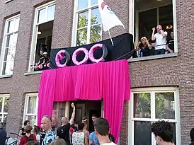 ![]() Штаб-квартира, украшенная по случаю Амстердамского гей-парада, 2016 год | |