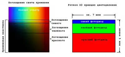 Особенностью матриц Foveon является то, что фотодиоды, формирующие цветной элемент изображения, расположены друг над другом, образуя «колонку», перпендикулярную поверхности матрицы. Поскольку коэффициент поглощения света в кремнии в оптическом диапазоне монотонно зависит от длины волны[2], то синяя часть спектра поглощается преимущественно верхним слоем (толщина 0,4 мкм), зелёная средним (толщина 2 мкм) и красная нижним слоем (более 2 мкм), разделенных p-n-переходами и имеющими отдельные выводы сигнала. Такая компоновка позволяет получить полную информацию по трем цветовым каналам в одной точке[3].