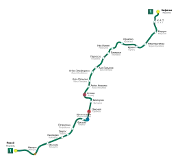 Из Пирея линия проложена до прибрежной зоны Фалиро, затем параллельно главной дороге связывающей Афины и Пирей на север, до станции «Тисси́о». Между станциями «Монастыра́ки» и «Аттики́» линия проложена подземным способом. На станции «Монастыра́ки» расположен пересадочный узел на линию 3, а на станциях «Омо́ния» и «Аттики́» на линию 2.